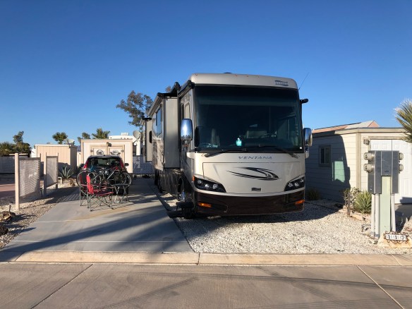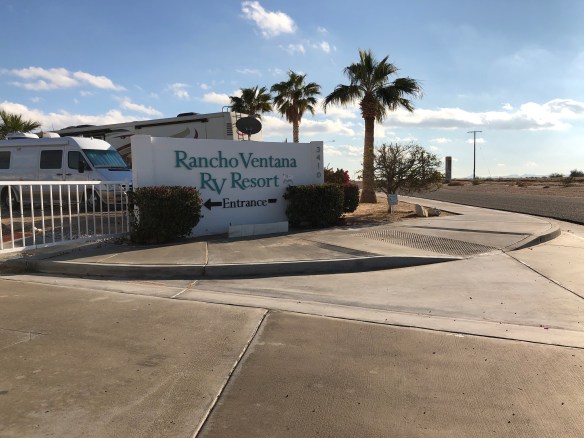 Our campground in Blythe is quite small, 200 campsites, surrounded on 2 sides by an 18 hole golf course and mountains on the other. All these sites are privately owned, and we are renting from an owner for a month for $350. We have a pool and activities in the club house. Blythe is only 30 minutes from Quartzsite where we’ll be joining OOBerfest for a week in January for a rally.