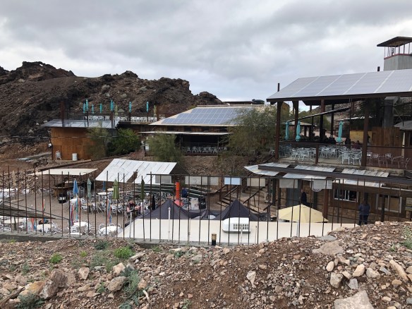 In the middle of nowhere the bar/restaurant contained 2 or 3 dining areas, a bar and live band. All solar panels on the roofs over the tables