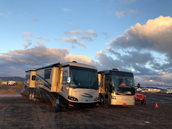 We were going to OOBerfest for our first RV event and boondocking experience. OOberfest, which is hosted by Dave and Brenda Bott from Outside Our Bubble were expecting 140 coaches, Price of admission, a bundle of wood for the campfires. It was raining just outside Phoenix and in Quartzsite pretty hard. When we got to our area the rain pretty much stopped, but there was high water in some of the washes that we needed to drive over to get to the parking area where we were meeting the other attendees. The coach really got messy.