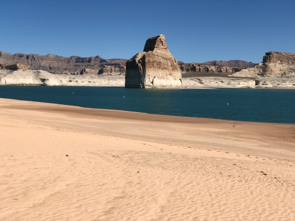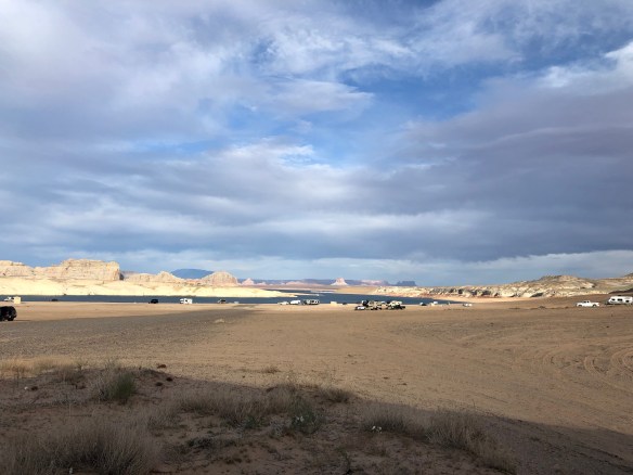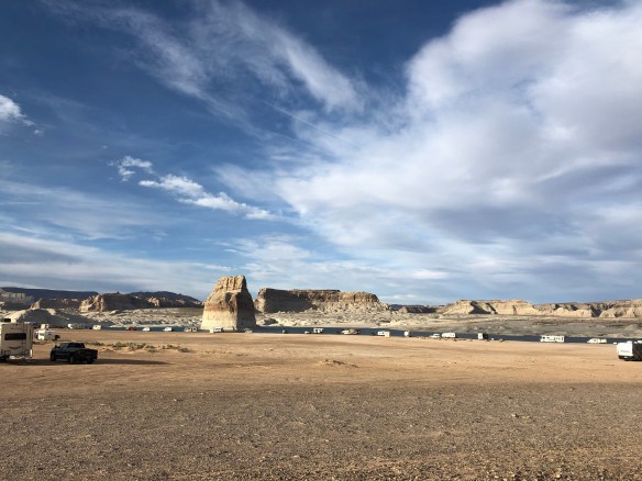 We left Winslow and headed North to Page AZ area,  The drive took us through Navajo country that was quite sparse. Driving through and over the mesas we would come across an occasional Indian village. In the 3 1/2 hour drive, we came upon one town, Tuba City before we arrived in the Lake Powell area and the town of Page.  8 miles west of Page there’s a large boondocking area  at Lone Rock Beach Primitive Camping in Big Water, UT on Lake Powell. The entrance to Lone Rock is probably 500 yds into Utah. and at $7 per day and nice weather forecast we decided it worth staying a while