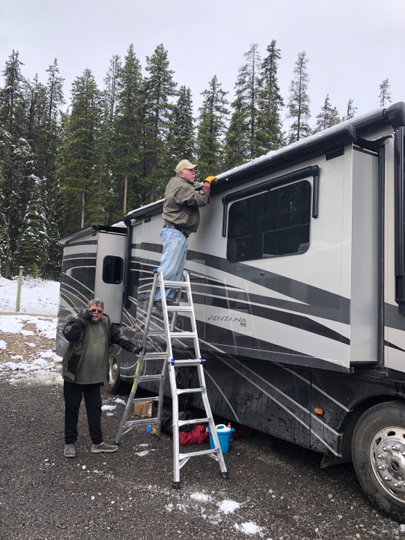 Our neighbor Jerry borrowed out ladder and squeegee to clean the snow off his slide toppers and then he did ours also. We tried to stop him, but he insisted.
