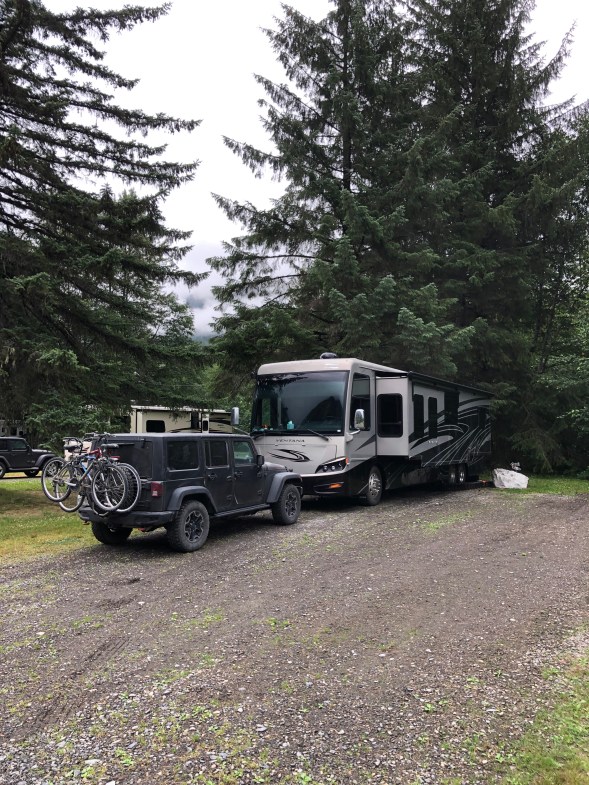 We decided to turn right before Watson Lake and jump on the Cassiar Highway heading South on our way back to the lower 48. This is the other route into and exiting Alaska. It’s 450 miles from beginning to end, down what seemed like a country lane with soft shoulders before we arrived at Mountain Shadows Campground in Iskut. We’re really in the backwoods of British Columbia now with little to no cell or internet