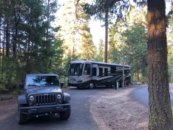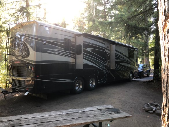 We started out with a pull-through site, but our neighbor came over and said he was leaving the following day and his back in site was much more private and it appeared our coach would fit, so we moved into our new home before the holiday weekend.