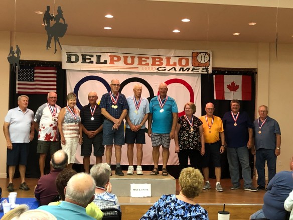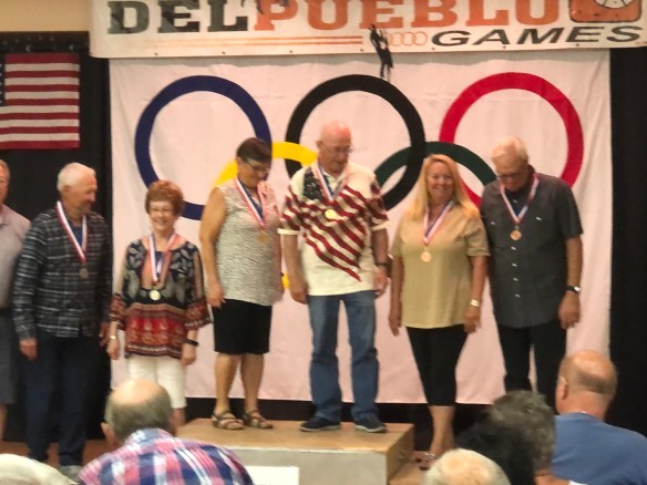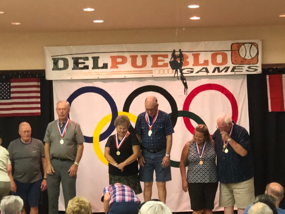 Dave’s wife Judy accepting her bronze medal for mixed doubles shuffleboard