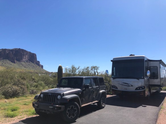 After our 4 wheeling fun in Florence, we landed back at Lost Dutchman State Park in Apache Junction for 1 night prior to solar and battery install. We were so ready and excited. Boondocking , which we love to do was becoming a problem having to use the generator for long periods, not only is it noisy but also mitigates the money saved not paying the park fees, by using a ton of diesel fuel.