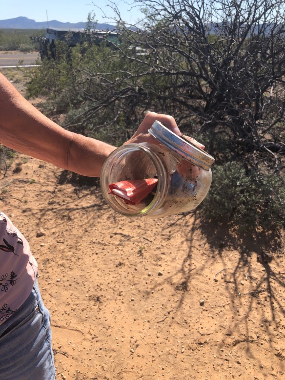While we were looking, Chris stopped for a 10-100 in jeep terms for a bathroom break, 100 yards from a sign that warned there were 6 different species of rattle snakes in the area. OOPS..