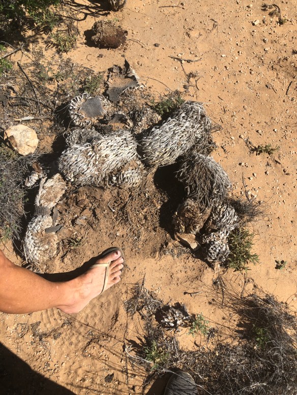 Not the best footwear for geocaching. The cache was under the dead cactus.