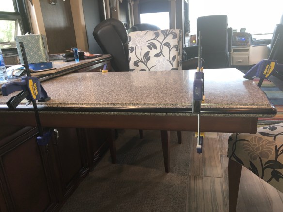 The wooden band under our dinning table fell into Steves lap when he was fixing the cabinet door that needed to have plastic grommets glued