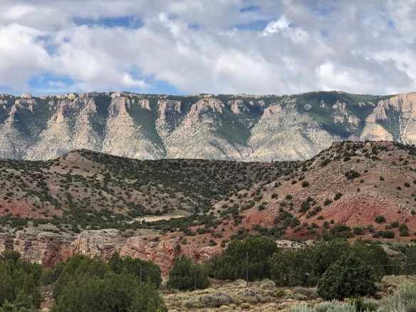 Our first campground was in a small National Forest area called Red Shale. A campground not really suited for a 40’ rig, but we traversed the 2 loops gingerly and squeazed into one of two sites that were long enough. The one other camper in residence moved off the following day, and we had the place to ourselves