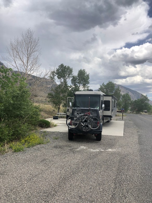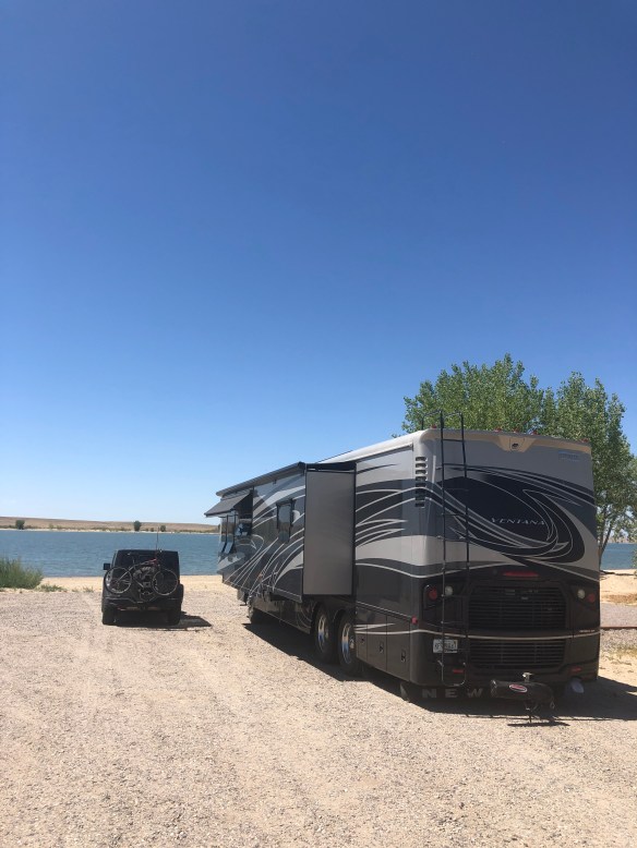After Cody we drove south to Boysen State Park. When we arrived on Sunday afternoon our reserved spot was occupied by a large group with their boats and jet skis. We went over to the “host” who turned out not to be and just taking advantage of a free site, to ask about the squatters and they just told us they were having lunch and looked in no hurry to move. We even spoke to the Park a ranger who was more sympathetic with them.