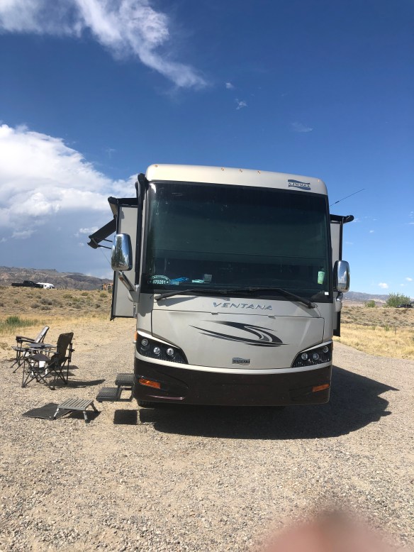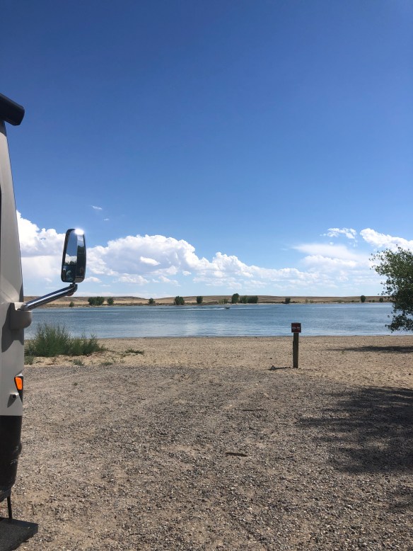 After Cody we drove south to Boysen State Park. When we arrived on Sunday afternoon our reserved spot was occupied by a large group with their boats and jet skis. We went over to the “host” who turned out not to be and just taking advantage of a free site, to ask about the squatters and they just told us they were having lunch and looked in no hurry to move. We even spoke to the Park a ranger who was more sympathetic with them.